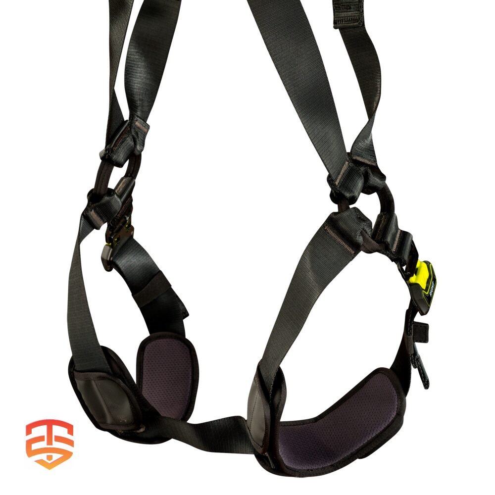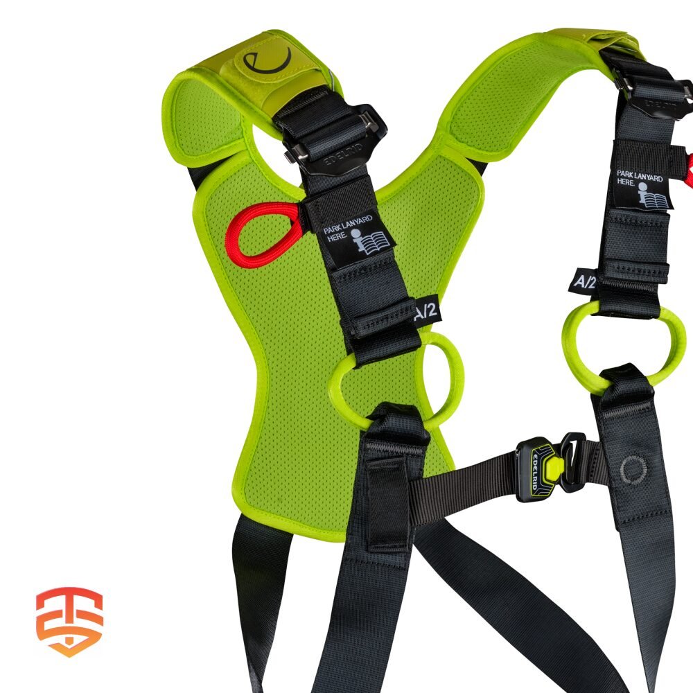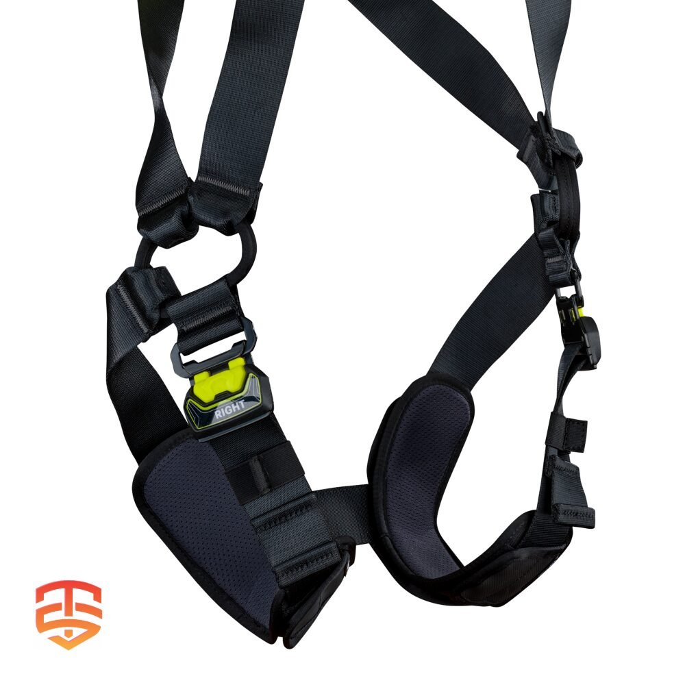 - Textiele valstopperogen (dorsaal en tweedelig sternaal) volgens EN 361 blijven open onder voorspanning en maken het mogelijk om gemakkelijk nog een karabijnhaak aan te brengen.