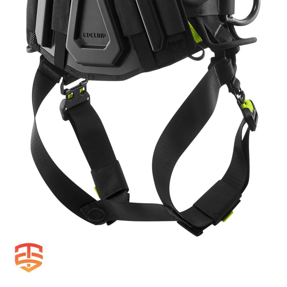 - Textiele valstopperogen (dorsaal en tweedelig sternaal) volgens EN 361 blijven open onder voorspanning en maken het mogelijk om gemakkelijk nog een karabijnhaak aan te brengen.
